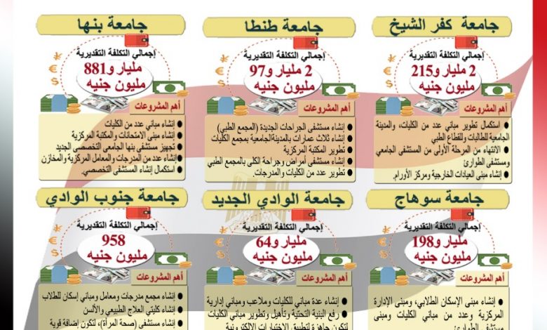استعرض د. خالد عبدالغفار وزير التعليم العالي والبحث العلمي، تقريرًا حول المشروعات التنفيذية لتطوير الجامعات الحكومية، وذلك في إطار حرص القيادة السياسية على تحسين الخدمات التعليمية التي يتم تقديمها للطلاب في الجامعات. وأفاد التقرير بأن إجمالي عدد المشروعات التي يتم تنفيذها في عدد 27 جامعة حكومية بلغ 428 مشروعًا ( 177 تعليمي – 113 مستشفيات – 134 خدمي – 4 إنتاجي)، بقيمة إجمالية بلغت نحو 36 مليار و464 مليون جنيه.واستعرض التقرير أبرز المشروعات التنفيذية بالجامعات الحكومية، والتي جاءت على النحو التالي:-مشروعات جامعة القاهرة بلغت تكلفتها نحو 2 مليار و357 مليون جنيه، ومن أهمها تطوير مستشفيات (الأمراض الباطنة وأورام الثدي والنساء والتوليد والأمراض المتوطنة) وتجديد مباني العيادات الخارجية والاستقبال والطوارئ والمدرجات ورفع كفاءة العديد من الأقسام ومباني الكليات والمستشفيات والمكتبات.مشروعات جامعة الإسكندرية بلغت تكلفتها نحو 3 مليار و771 مليون جنيه، ومن أهمها إنشاء مباني تعليمية وإدارية للكليات وصيانة ورفع كفاءة مباني الكليات والمعامل والعيادات، وإنشاء مدرجات وفصول دراسية.مشروعات جامعة عين شمس بلغت تكلفتها نحو مليار و786 مليون جنيه، ومن أهمها تطوير مستشفى النساء، وتطوير مباني الكليات والقاعات الرقمية والمدرجات والفصول الدراسية والمعامل ومركز البيانات والمسارح.مشروعات جامعة أسيوط بلغت تكلفتها نحو 736 مليون جنيه، ومن أهمها إنشاء مستشفى الطب البيطري وطب الأسنان، واستكمال إنشاء مركز الإصابات والطوارئ، ومجمع معامل البحوث، وكلية رياض الأطفال، وإعداد البنية التحتية بأسيوط الجديدة.مشروعات جامعة مدينة السادات بلغت تكلفتها نحو 2 مليار و820 مليون جنيه، ومن أهمها تأهيل عمارات السكن الطلاب، وجار إنشاء مباني إدارية وفصول دراسية ومعامل ومدرجات بعدد من الكليات، بالإضافة إلى رفع كفاءة البنية التحتية بالجامعة.مشروعات جامعة أسوان بلغت تكلفتها نحو 2 مليار و259 مليون جنيه، ومن أهمها الانتهاء من تطوير مباني بعض الكليات وتجديد بعض المعامل، كما أنه جارٍ إنشاء مستشفى (باطنة وأطفال)، وإنشاء مراكز طبية متخصصة، وإنشاء مبنى كليتي السياحة والتمريض، وتطوير عدد من الفصول الدراسية والأقسام،وتطوير مستشفى الاستقبال والطوارئ بمستشفى أسوان الجامعي.مشروعات جامعة كفر الشيخ بلغت تكلفتها نحو 2 مليار و215 مليون جنيه، ومن أبرزها استكمال تطوير مباني عدد من الكليات، والمدينة الجامعية للطالبات وللقطاع الطبي، وإنشاء مدرجات مركزية والانتهاء من المرحلة الأولى من المستشفى الجامعي ومستشفى الطوارئ، وإنشاء مبنى العيادات الخارجية ومركز الأورام.مشروعات جامعة طنطا بلغت تكلفتها نحو 2 مليار و97 مليون جنيه، ومن أهمها إنشاء مستشفى الجراحات الجدیدة (المجمع الطبي)، وإنشاء ثلاث عمارات بالمدینة الجامعیة بمجمع الكلیات، وتطوير المكتبة المركزية، وإنشاء مستشفى أمراض وجراحة الكلى بالمجمع الطبي، وتطوير عدد من الكليات والمدرجات.مشروعات جامعة بنها بلغت تكلفتها نحو مليار و881 مليون جنيه، ومن أهمها إنشاء مباني عدد من الكليات، وجار إنشاء مبنى الامتحانات والمكتبة المركزية، وتجهيز مستشفى بنها الجامعى التخصصى الجديد، بالإضافة إلى إنشاء عدد من المدرجات والمعامل المركزية والمخازن، واستكمال إنشاء المستشفى التخصصي.مشروعات جامعة بورسعيد بلغت تكلفتها نحو مليار و840 مليون جنيه، ومن أهمها استكمال الأعمال الإنشائية للمستشفى التعليمي الجامعي لكلية الطب، التي ستكون إضافة قوية لمنظومة الرعاية الصحية في مصر، وإنشاء مباني إدارية وتعليمية.مشروعات جامعة دمنهور بلغت تكلفتها نحو مليار و624 مليون جنيه، ومن أهمها إنشاء مبنى بعض الكليات ومباني تعليمية ورفع كفاءة المعامل المركزية واستكمال الأعمال الإنشائية للمستشفى الجامعي لكلية الطب.مشروعات جامعة دمياط بلغت تكلفتها نحو مليار و375 مليون جنيه، ومن أهمها إنشاء مجمع المعامل المركزية وتجه