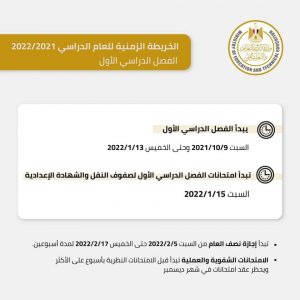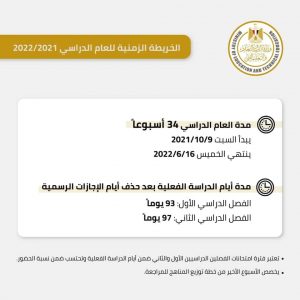 ووفقًا للخريطة الزمنية، يبدأ الفصل الدراسى الأول للعام الدراسى الجديد 2021-2022، يوم السبت الموافق 9 أكتوبر 2021 ويستمر حتى يوم 13 فبراير 2022 (مدة أيام الدراسة الفعلية 93 يومًا)، على أن يبدأ الفصل الدراسى الثانى يوم 19 فبراير 2022 ويستمر حتى 9 يونيو 2022 (مدة الدراسة الفعلية 97 يومًا).