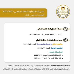 وتبدأ امتحانات الفصل الدراسي الأول يوم السبت الموافق 15 يناير 2022، على أن تبدأ امتحانات الفصل الدراسي الثاني لصفوف النقل والشهادة الإعدادية يوم السبت الموافق 7 مايو 2022، على أن تبدأ امتحانات الدبلومات الفنية يوم السبت 21 مايو 2022، وتقام امتحانات الثانوية العامة يوم السبت 11 يونيو 2022.