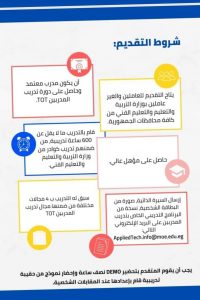 وقال الدكتور عمرو بصيلة رئيس الإدارة المركزية لتطوير التعليم الفني، ومدير وحدة تشغيل وإدارة مدارس التكنولوجيا التطبيقية، إن تقديم المدربين المعتمدين سيتاح للعاملين والغير عاملين بوزارة التربية والتعليم والتعليم الفني من كافة محافظات الجمهورية، ويجب على المدرب أن يكون قد حصل علي دورة تدريب المدربين TOT وأن يكون قد قام بالتدريب ما لا يقل عن 600 ساعة تدريبية، من ضمنهم تدريب كوادر من وزارة التربية والتعليم والتعليم الفني، وسبق له التدريب ب 4 مجالات مختلفة من ضمنها مجال تدريب المدربين TOT.