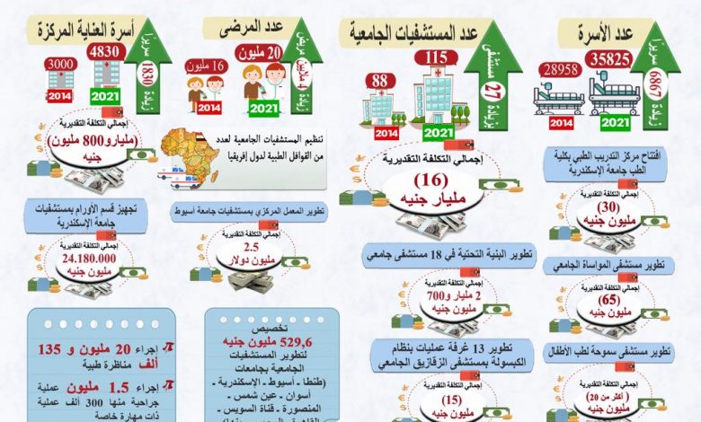 زيادة عدد المستشفيات الجامعية من ٨٨ مستشفى عام ٢٠١٤ إلى ١١٥ مستشفى عام ٢٠٢١
