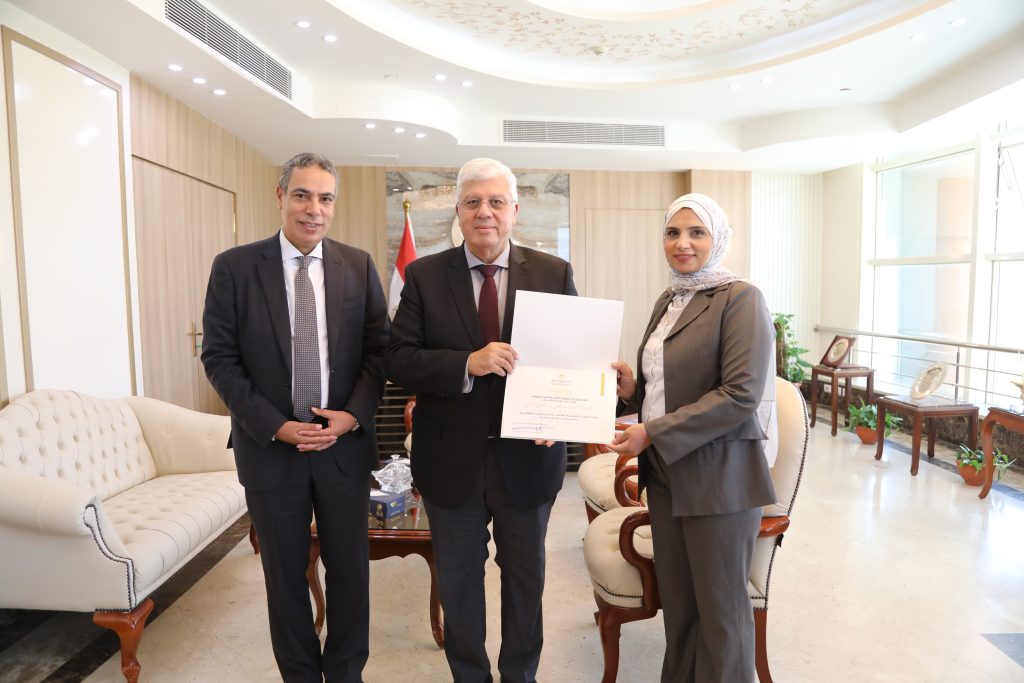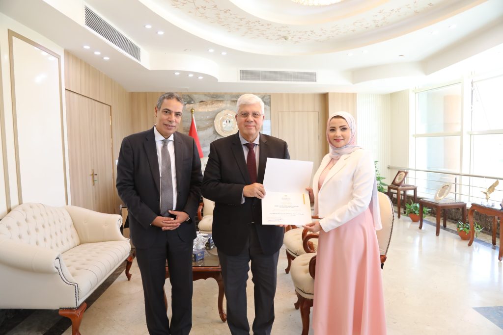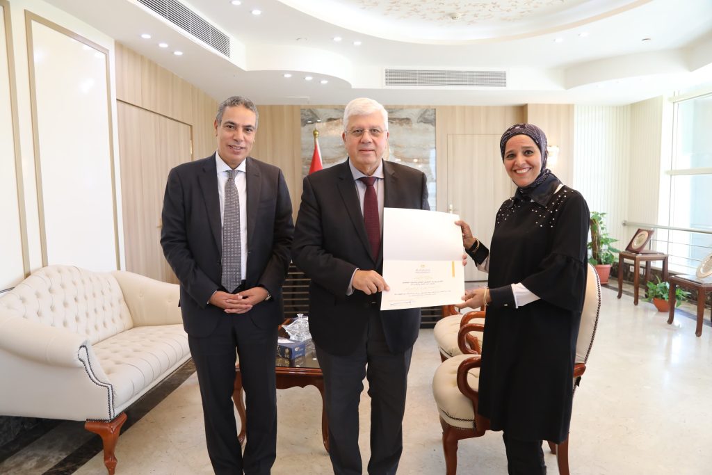 وزير التعليم العالي يكرم الدكتورة إبتسام فوزي تميم مدير عام الإدارة العامة للمكتب الإعلامي