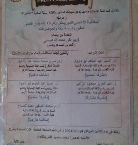 يناقش قسم اللغة الاسبانية وآدابها بكلية اللغات والترجمة بجامعة الأزهر رسالة العالمية “الدكتوراة” وعنوانها : “المخطوط الاعجمى_الموريسكى_رقم 58 بالمجلس العلمى (تحقيق ودراسة للغة والموضوعات) المقدمة من الباحث : كريم على محمد الدعبوسى (المدرس المساعد بالقسم )