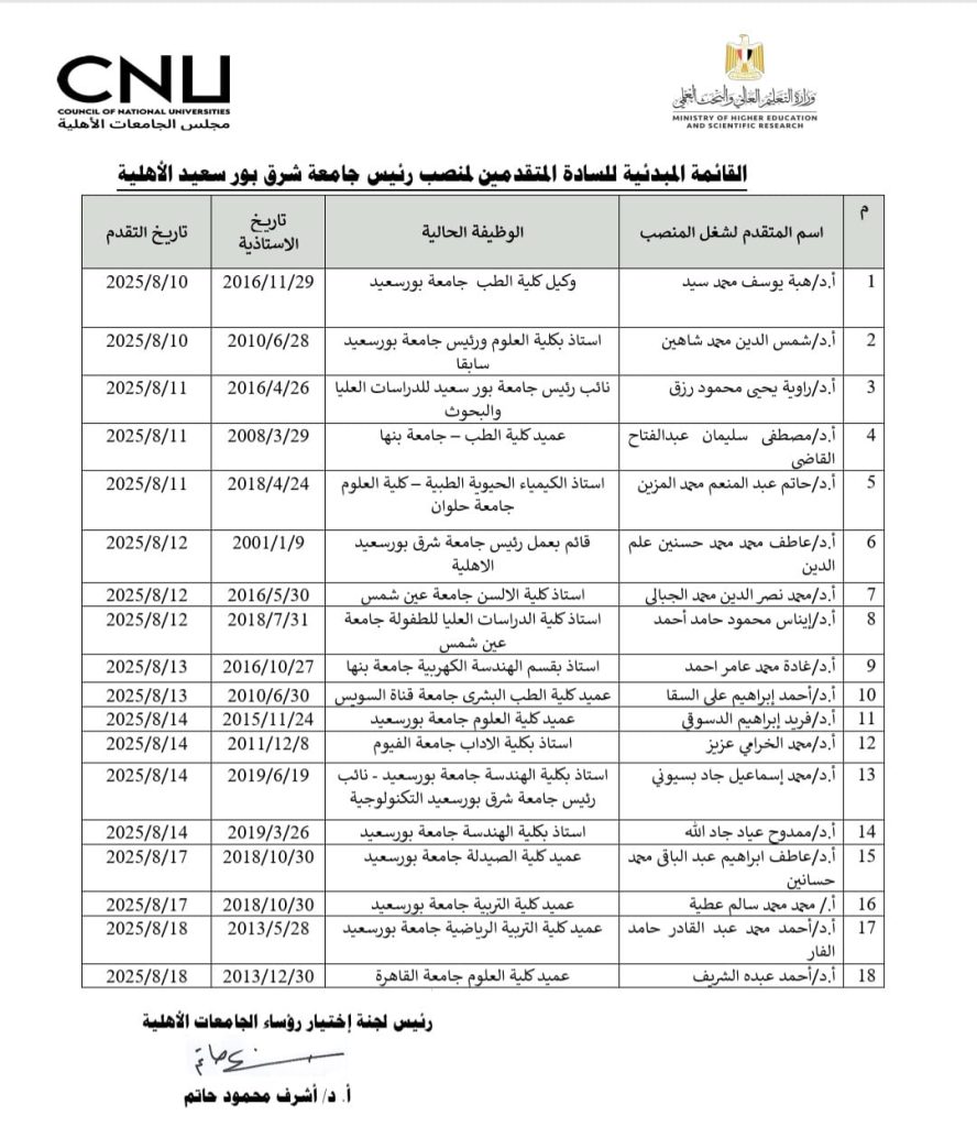 • 18 مرشحًا لرئاسة جامعة شرق بورسعيد الأهلية.