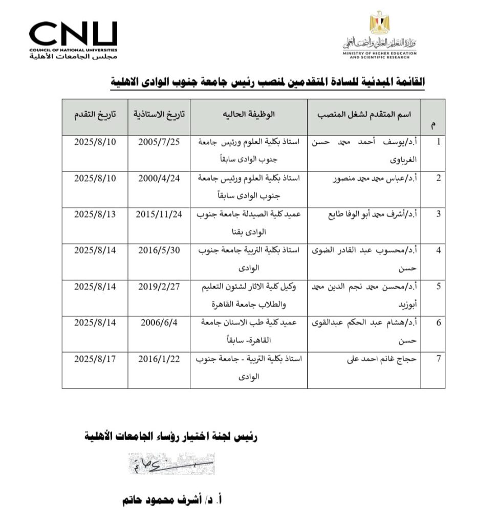 • 7 مرشحين لرئاسة جامعة جنوب الوادي الأهلية.