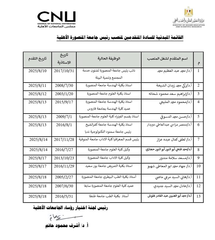 • 13مرشحًا لرئاسة جامعة المنصورة الأهلية.