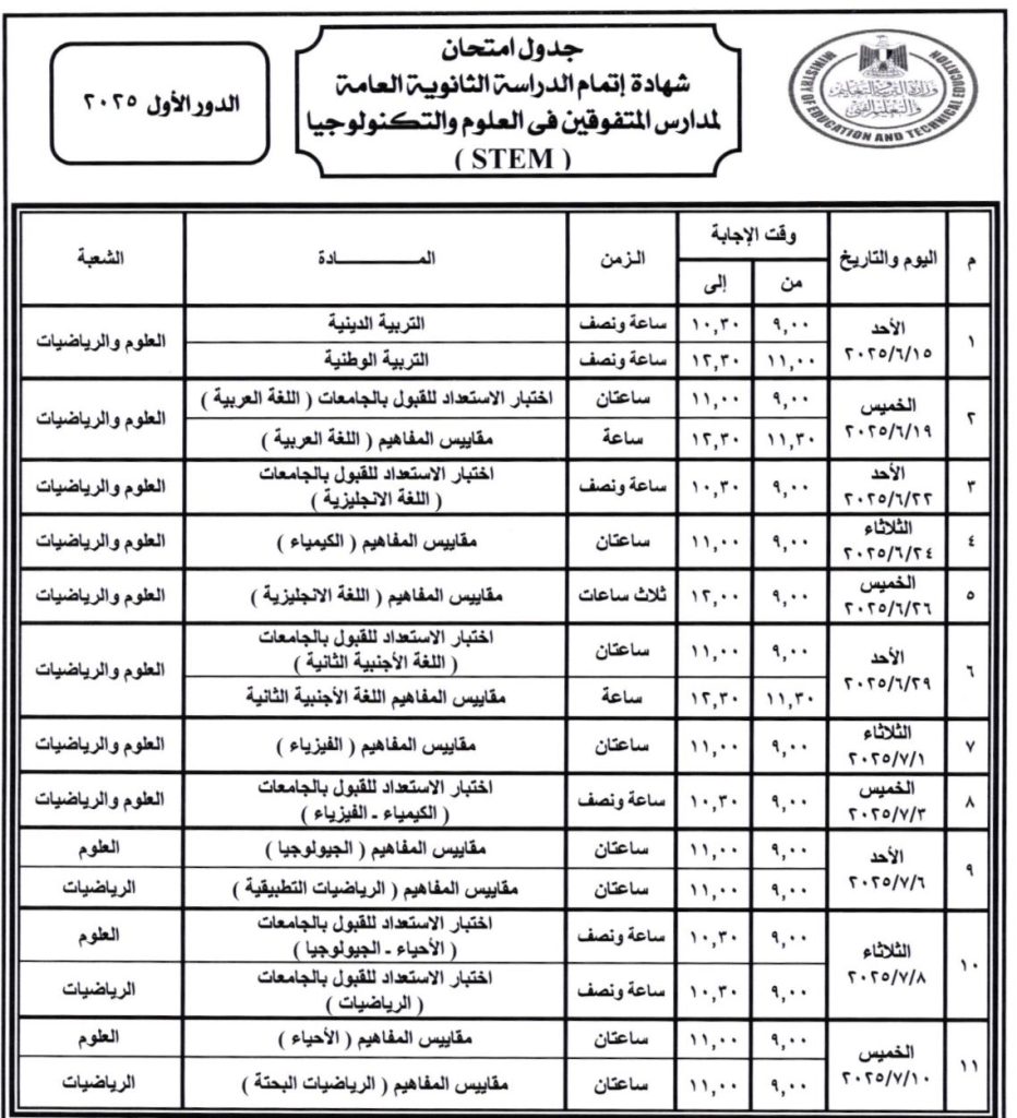 جدول امتحانات شهادة إتمام الثانوية العامة للدور الأول 2025