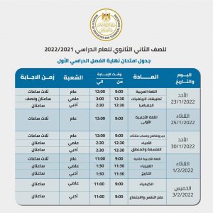 جدول امتحانات نصف العام لطلاب الصف الثانى الثانوى