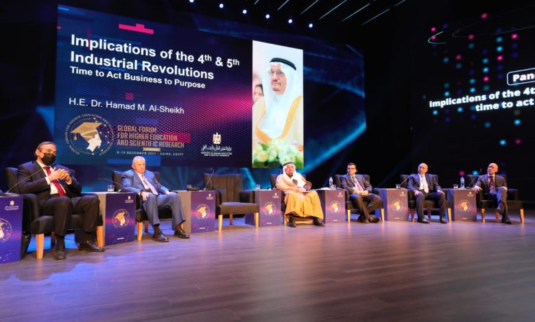 فى إطار فعاليات المنتدى العالمي للتعليم العالي والبحث العلمي بعنوان (رؤية المستقبل) والذى تنظمه وزارة التعليم العالي والبحث العلمي خلال الفترة من 8 إلى 10 ديسمبر 2021، بالعاصمة الإدارية الجديدة، برعاية وتشريف السيد الرئيس عبدالفتاح السيسي رئيس الجمهورية، شهد د.خالد عبدالغفار وزير التعليم العالي والبحث العلمي جلسة نقاشية بعنوان “تداعيات الثورتين الصناعيتين الرابعة والخامسة: حان الوقت للعمل من أجل هدف”، بحضور د. حمد بن محمد آل الشيخ وزير التعليم السعودى، د.هاني مصطفى من جامعة Quebec بكندا، د.أيمن الباز أستاذ ورئيس قسم الهندسة الحيوية بجامعة لويزفيل، السيد/برادلي بيت Bradley Pitt قائد إستراتيجية الأعمال وبحوث التعليم العالي بمايكروسوفت للتعليم، د.إسماعيل عبد الغفار رئيس الأكاديمية العربية للعلوم والتكنولوجيا والنقل البحرى، د.حسام عثمان مستشار وزير الاتصالات وتكنولوجيا المعلومات للإبداع التكنولوجي وصناعة الإلكترونيات والتدريب.