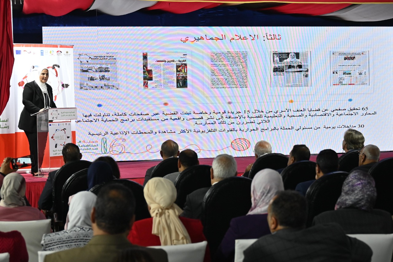 واستعرضت الوسائل الإعلامية التى استخدمتها الحملة بدءاً من طرق الأبواب واللقاءات المنزلية والمجتمعية ووسائل الإعلام ووسائل التواصل الاجتماعى والإعلام المقروء والمرئى وتنوع الجمهور المستهدف بدءا من النساء أنفسهم واستهداف المناطق الريفية والمناطق غير الآمنة والمسنات والمدرسين فى المدارس والأطفال فى سن الطفولة المبكرة للتوعية بقضايا العنف ومؤسسات المجتمع المدنى والمنظمات الدولية، موضحة أن الحملة استطاعت أن تصل إلى إجمالى عدد 22مليون شخص من خلال عدة قنوات أشهرها وسائل التواصل الاجتماعى والإعلام والتى وصلت لـ 10 ملايين مشاهد، وحملات التواصل المباشر واللقاءات الشعبية والتى وصلت لـ 2 مليون من السيدات وكل سيدة تنقل الرسالة إلى سيدات أخريات وأطفال لتكوين بيئة تحث على احترام الآخر وأيضا تطبيق الاستمارة الخاصة لقياس اتجاهات وسلوكيات الأسرة فى أماكن عدة لنتعرف بها على عدد 4 ملايين أسرة حتى نرصد كيف تفكر وماهى اتجاهاتها نحو قضايا العنف والأمية والإعاقة وهى قضايا الوزارة الأساسية التى نعمل من أجلها حتى نستطيع أن نوجه رسالتنا بالشكل الصحيح.