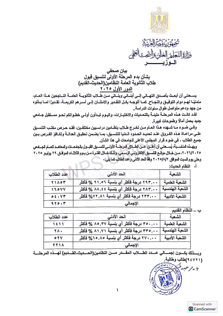 وأوضح الوزير أن مكتب التنسيق حرص على مراعاة الفروق بين النظامين القديم والحديث عند تحديد الحدود الدنيا للمرحلة الأولى، بما يضمن تحقيق العدالة وتكافؤ الفرص بين جميع الطلاب.